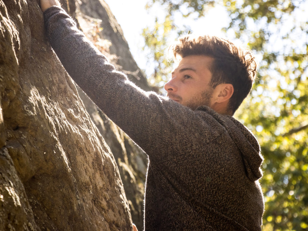 A man wearing The Vida Hoodie. He's camping in a canyon