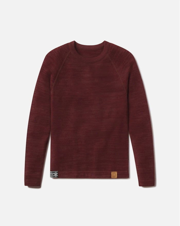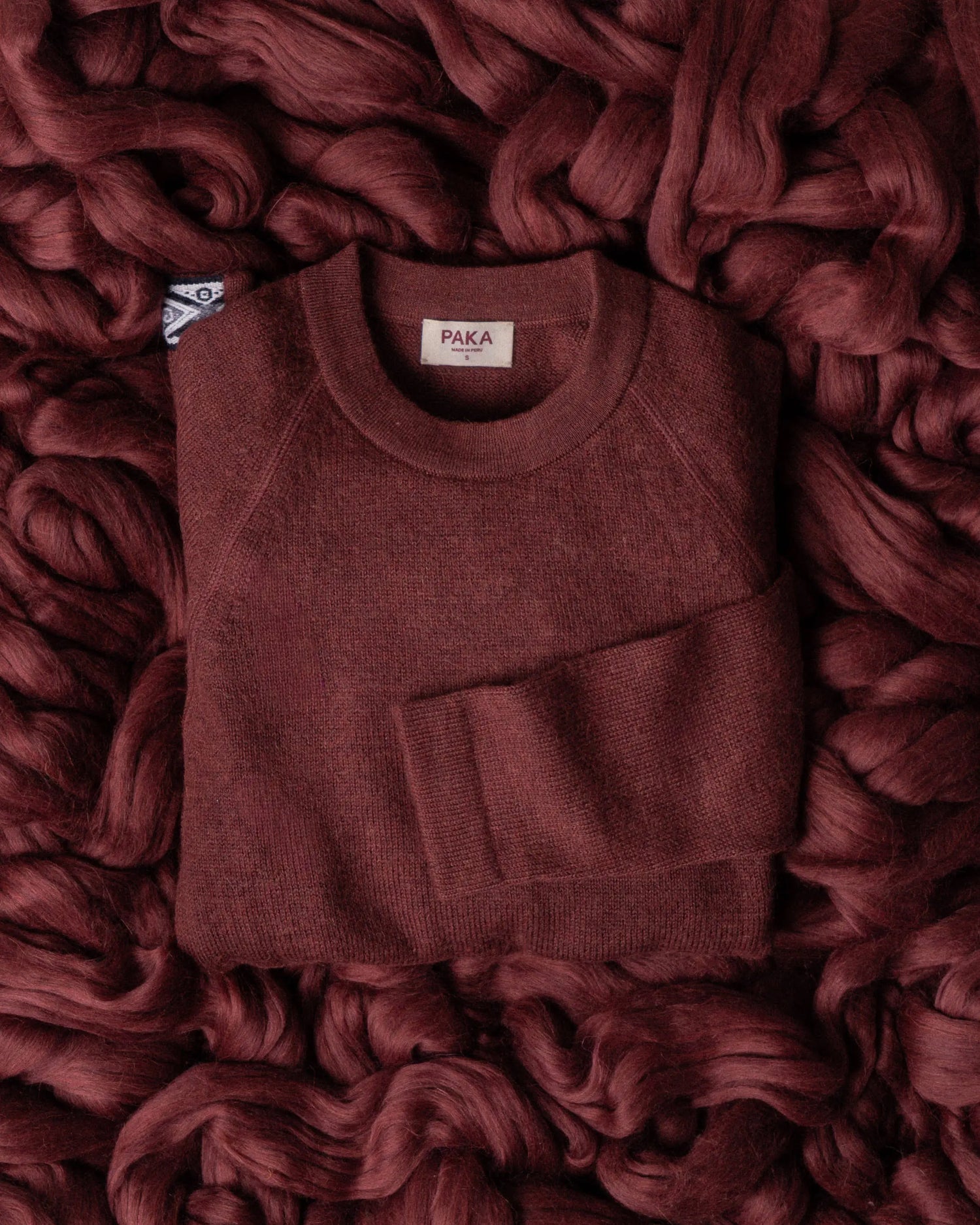 • Close-up of a PAKA's The Original Crew in Burgundy with a brand logo on the sleeve, worn over dark pants.