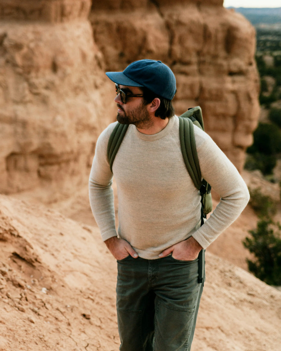 • Man wearing PAKA's Original Crew in Burgundy and sunglasses with a backpack, standing in a natural landscape.