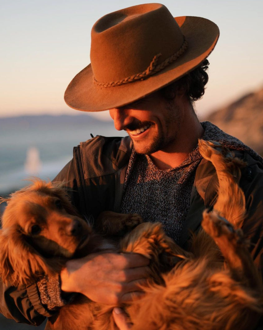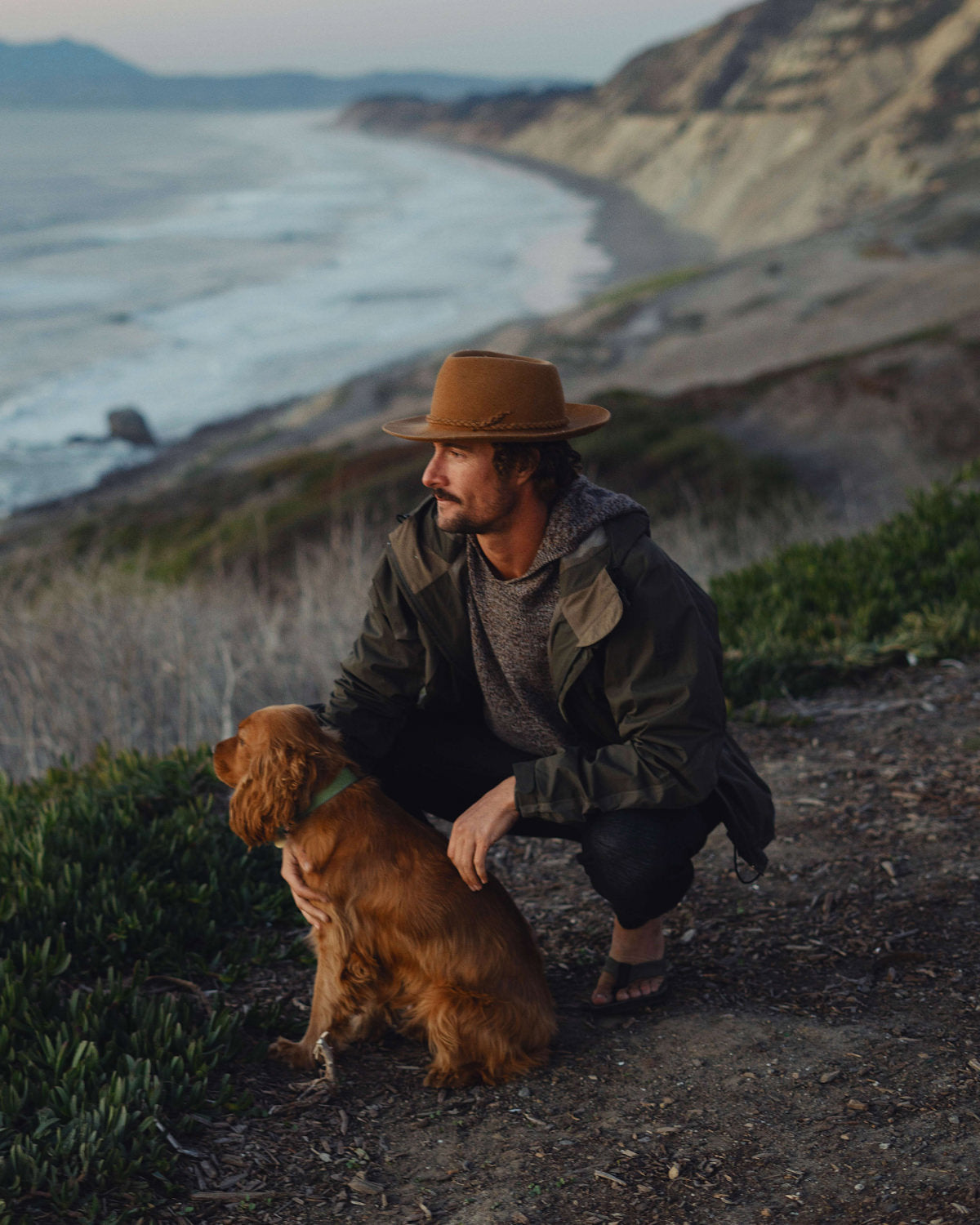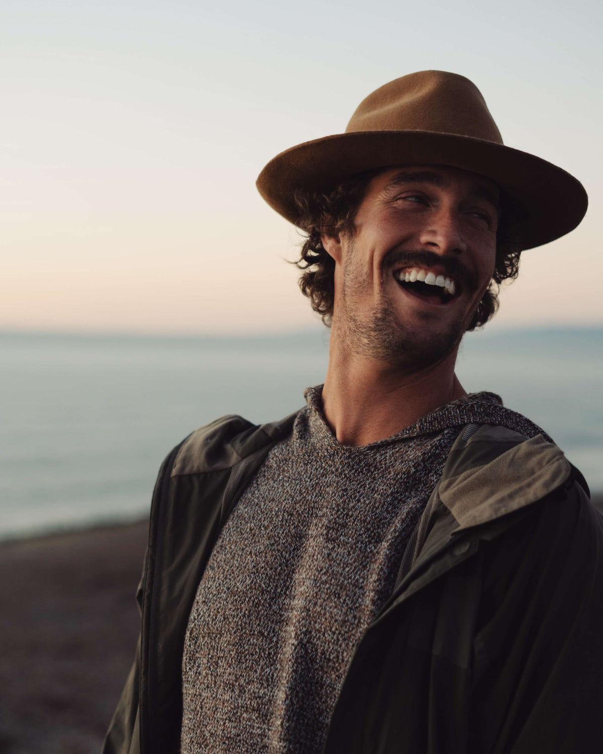 • Man wearing a brown hat and jacket standing on a beach with ocean in the background