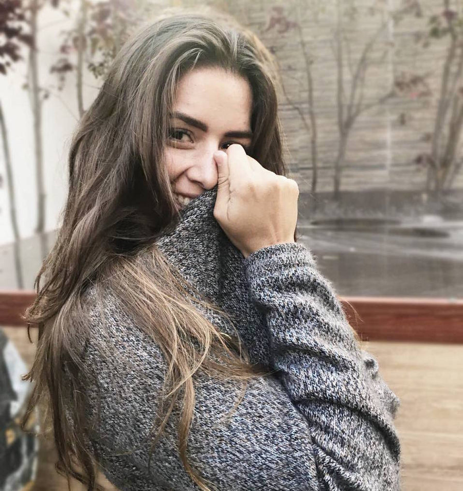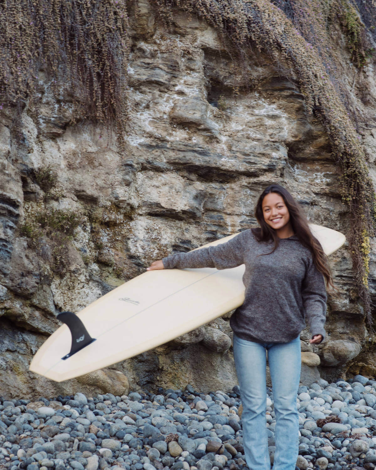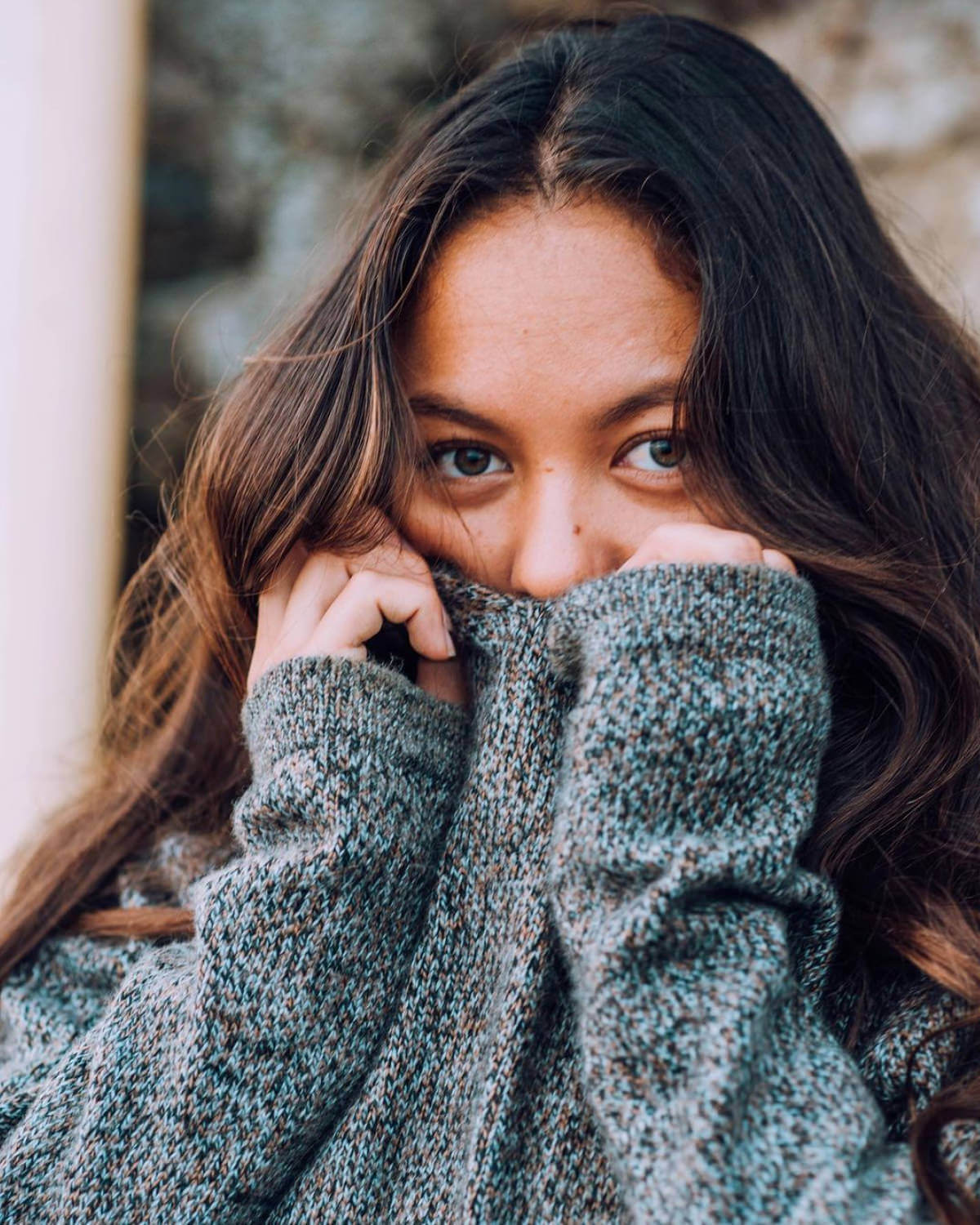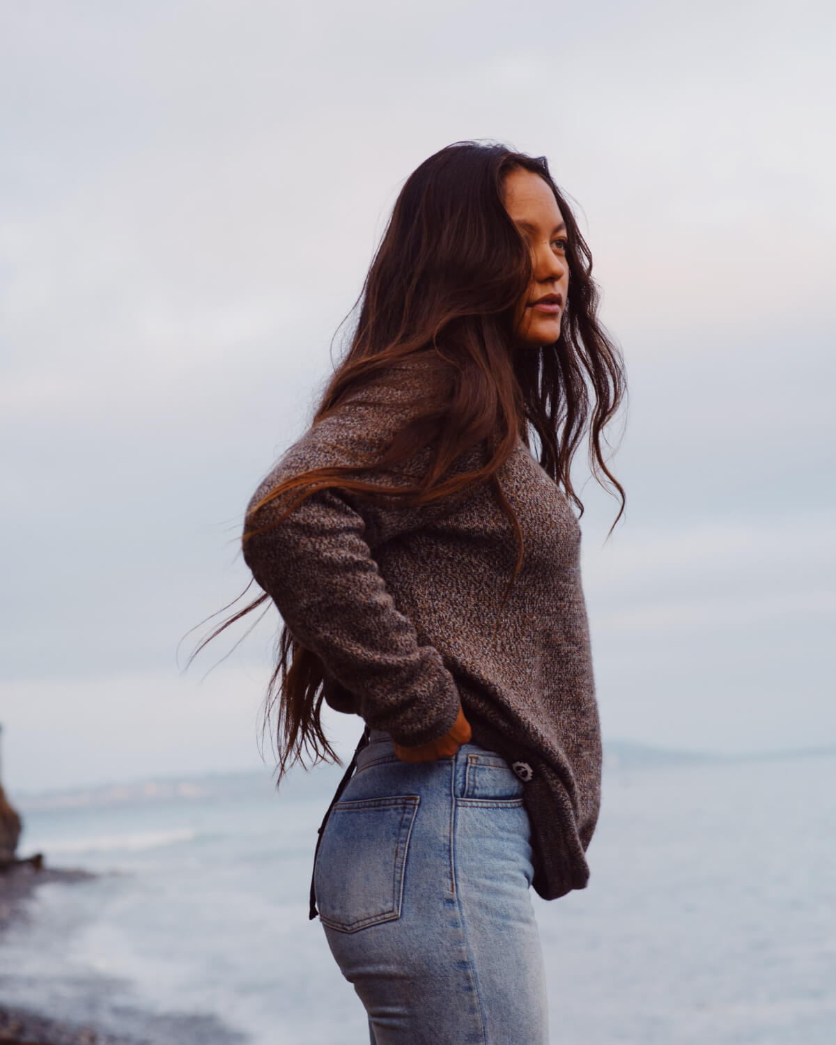 • Woman sitting in front of blue lake wearing the Vida sweater