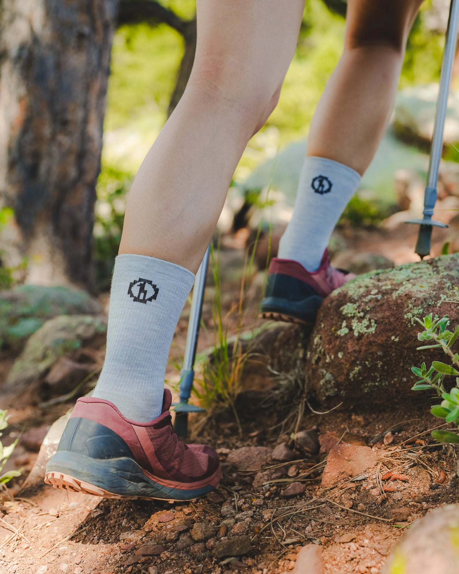 • Person hiking on a trail wearing lSilver socks with a logo and dark hiking shoes.