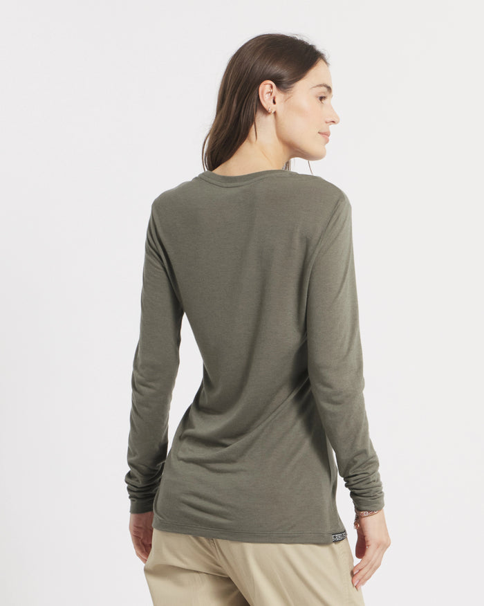 The Aire women’s long sleeve shirt features a naturally soft, lightweight and moisture-wicking blend of our sustainable alpaca fiber and tencel from eucalyptus. The result is a liquid-feeling, form-fitting layer for everything that requires a little extra comfort and flexibility, from hiking to traveling.