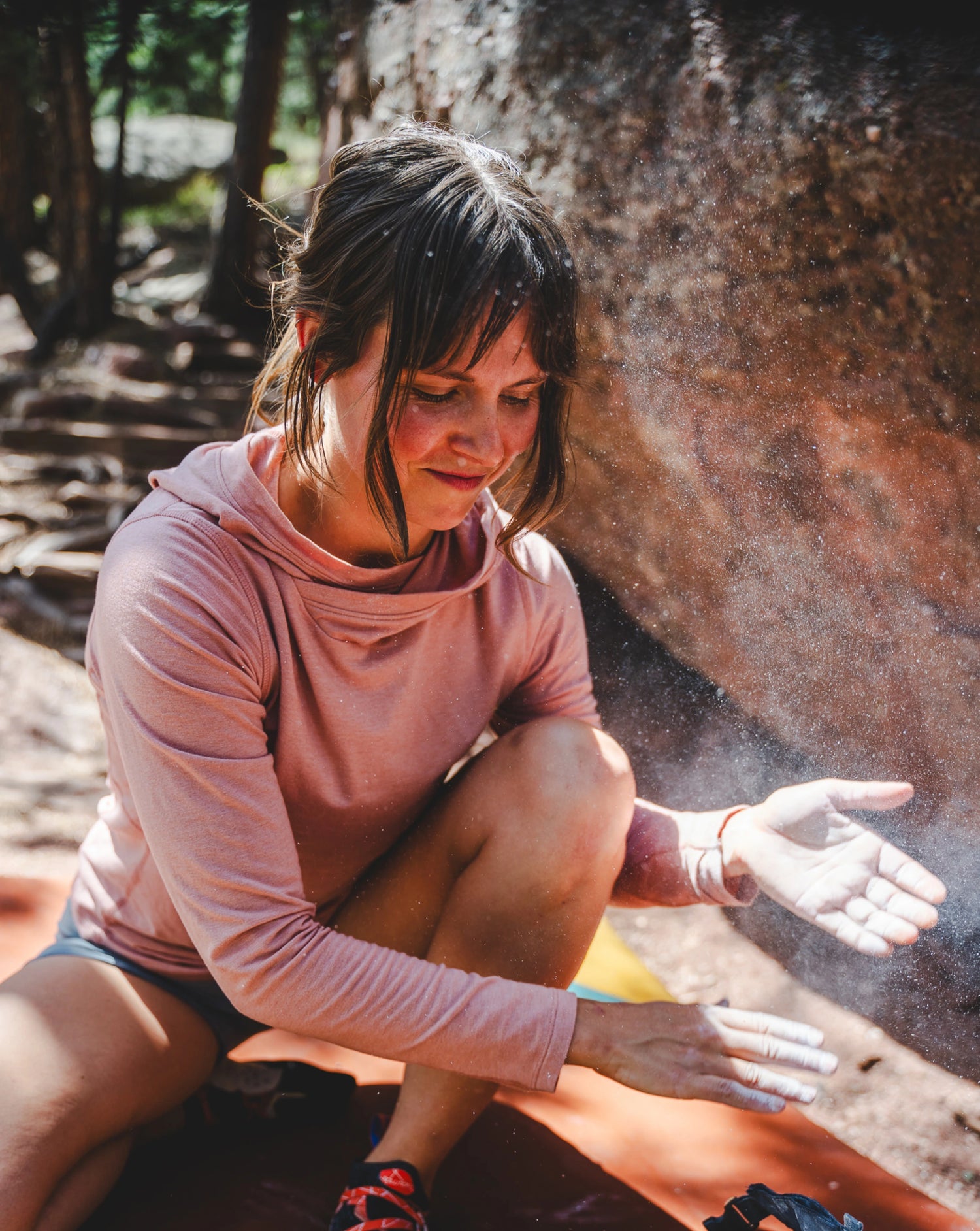Outdoor Close-Up of Hands Through Thumbholes of Sol Women's Lightweight Sun Hoodie – PAKA Apparel