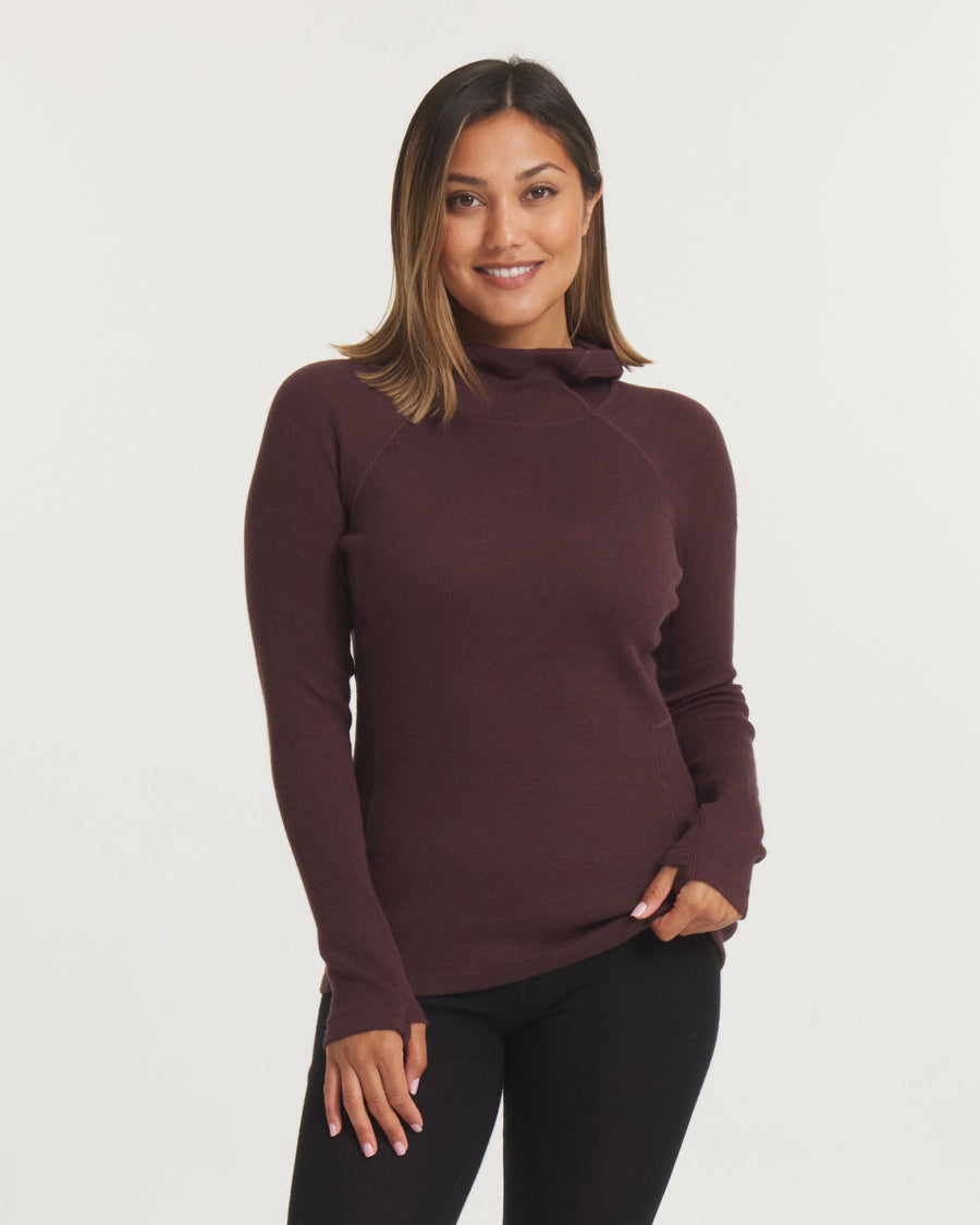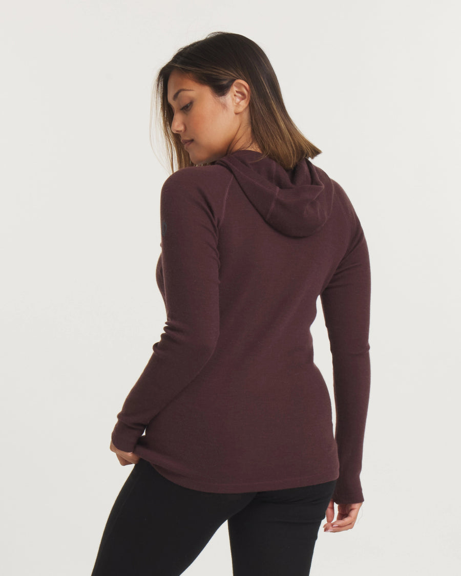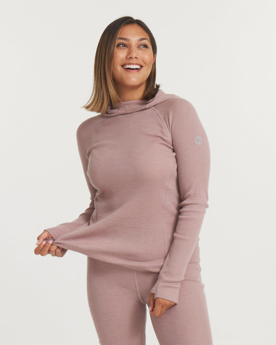 Build up the warmth with our Thermal Collection—made to keep things cozy, comfortable, and even stink-free thanks to earth-friendly ingredients and adventure-enhancing design. This thermal hoodie baselayer for women features a new and improved yarn blend to maximize durability and softness, while the updated slimmer fit makes it easy to layer. With an ergonomic hood, flat coverstitches for no itching or irritating, raglan armholes for freedom of movement, and improved thumbholes for security and coverage, this isn't your average baselayer!