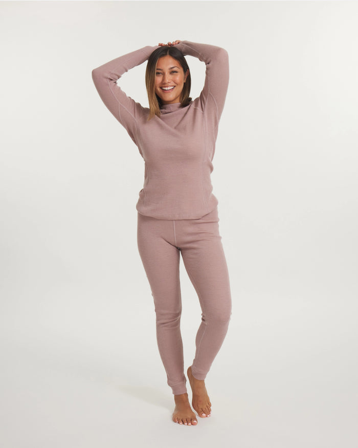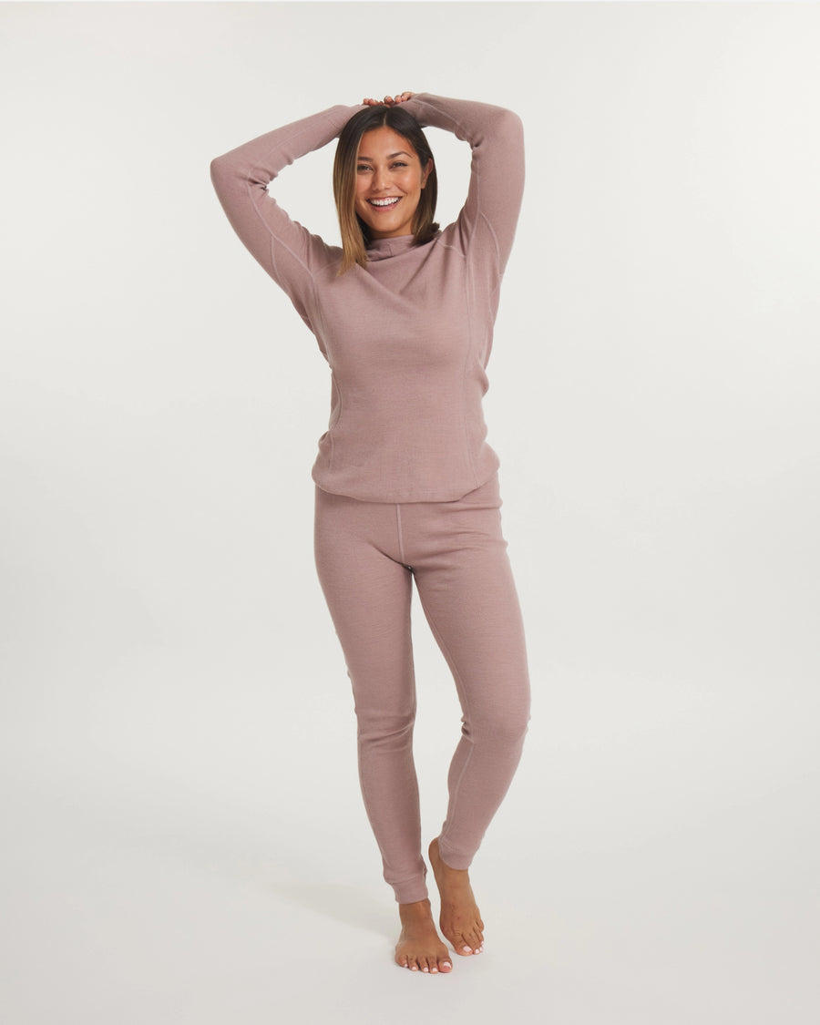 Our thermal baselayers feature a blend of alpaca, merino wool, and eucalyptus-derived tencel. We use Royal Alpaca, which is our softest micron range (17-19 microns). Wearing both tops and bottoms ensures you are protecting your skin with only natural fibers touching your body (no matter what you layer with).